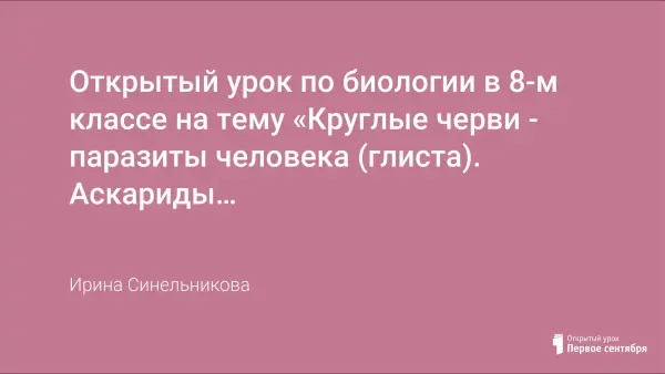 Задачи урока: уметь узнавать червей-паразитов по картинкам; знать о вреде для человека паразитических червей; обобщить и систематизировать знания о строении, процессах жизнедеятельности, образа жизни круглых червей к среде обитания; систематизировать знания о профилактике борьбы с глистными заболеваниями.