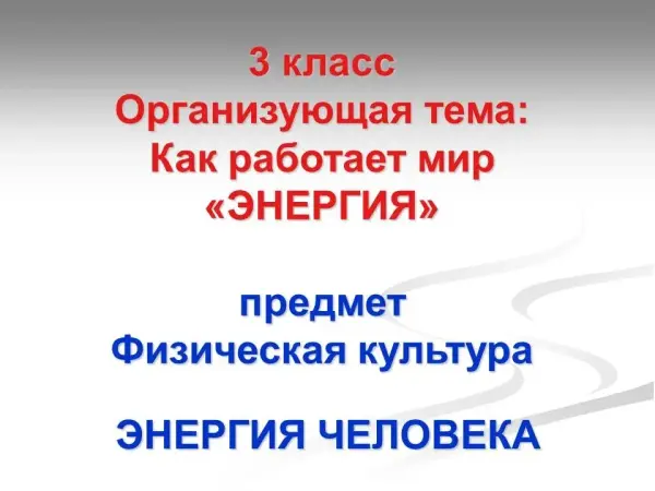 Тема энергия человека, затрагивается на физической культуре, во второй части исследования, когда ученики уже познакомились с разными видами и источниками энергии, законами сохранения и преобразования энергии. Ученикам становится интересна информация о своём питании и выборе продуктов. В дальнейшем, на уроках математики ребята рассчитывают количество калорий, которые получают с пищей на завтрак, обед, полдник в школе и ужин дома. Для закрепления темы выполняются практические задания и тесты.