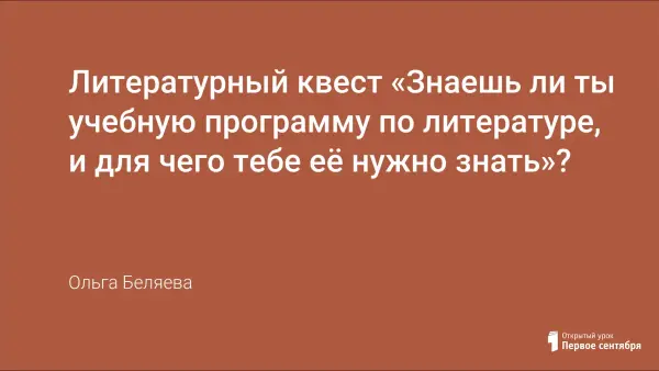 Литературный мини-квест «Знаешь ли ты учебную программу по литературе, и для чего тебе её нужно знать»? В представленном конспекте внеклассного мероприятия говорится о литературной игре по школьной программе для учеников 9-го класса. Учащиеся делятся на две команды и проходят пять испытаний; «соедини», «видеовопрос», «создай иллюстрацию», «объясни высказывание», «устное выступление». После каждого пройденного этапа проводится рефлексия, в конце мероприятия итоговая рефлексия на сплочение двух разных команд. Цель игры: обобщить и систематизировать знания по основным разделам программы.