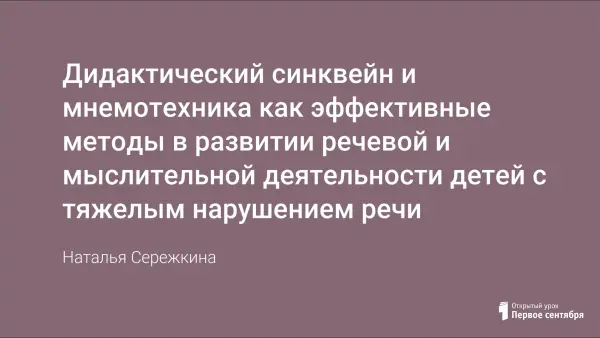 В статье представлен опыт работы по теме «Дидактический синквейн и мнемотехника как эффективные методы в развитии речевой и мыслительной деятельности детей с тяжелым нарушением речи». Описаны технология реализации, последовательность внедрения в работу с детьми с тяжелыми нарушениями речи современных технологий: мнемотехники и дидактического синквейна. Данные технологии развивают не только речь, но и способствуют развитию мышления, внимания, памяти, воображения, восприятия.