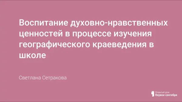 Духовные ценности – это патриотизм, любовь к Отечеству, забота о ближних, об окружающей природе, совесть. Воспитание нравственного идеала – это воспитание активной жизненной позиции у школьников, направленной на развитие страны, стремление к созидательной деятельности. Духовно-нравственное воспитание – это процесс организованного, целенаправленного внешнего и внутреннего воздействия педагога на духовно-нравственную сферу личности. Фактором такого воздействия выступает географическое краеведение.