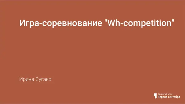 Данная методическая разработка по английскому языку «Wh-competition» предназначена для обучающихся 3-го класса средних общеобразовательных школ. Представлена в виде игры-соревнования с использованием технологии активных методов обучения, личностно-ориентированных и здоровьесберегающих технологий. Цель: создание условий для формирования коммуникативной компетенции через организованную игровую деятельность. Планируемые результаты: обучающиеся научатся строить специальные вопросы, использовать их в устной и письменной речи.