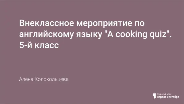 Данная разработка представляет собой внеклассное мероприятие по английскому языку “A cooking quiz” для учащихся 5-х классов, целью которого является повышения интереса учащихся к изучению английского языка. Мероприятие может быть проведено как итоговый урок по теме «Еда», так и во время декады английского языка.