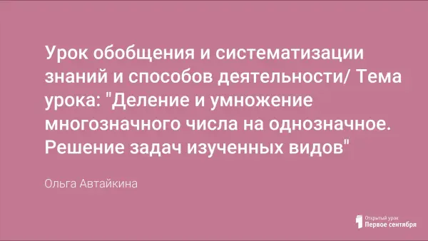 Цели урока: рассмотреть письменные приёмы деления и умножения многозначного числа на однозначное, развивать навыки устного и письменного счёта, логического мышления; воспитывать интерес к математике, активность, внимание учащихся.