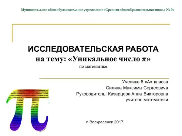 Цель работы: изучение вычисления значения числа – различными методами. Число π является одним из интереснейших чисел, встречающихся при изучении математики. Оно встречается в разных школьных дисциплинах. С числом π связано много удивительных фактов, поэтому оно вызывает интерес к изучению.