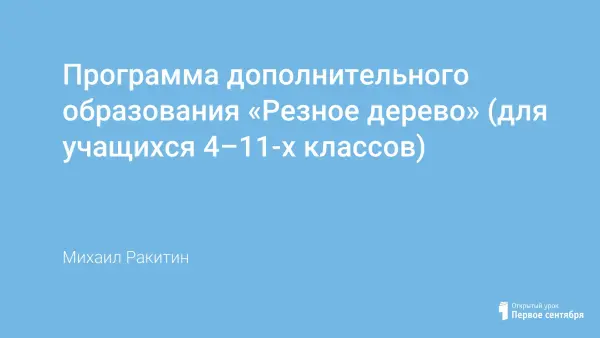 Программа дополнительного образования «Резное дерево» разработана в соответствии с требованиями ФГОС и предназначена для учащихся 4–11-х классов. Основное направление программы – русская народная и современная резьба по дереву. Отличительной особенностью и новизной программы «Резное дерево» является изготовление изделий русской народной культуры, характерных для Твери и Тверской области, воссоздание изделий по оригинальной, в том числе этнографической и археологической литературе.