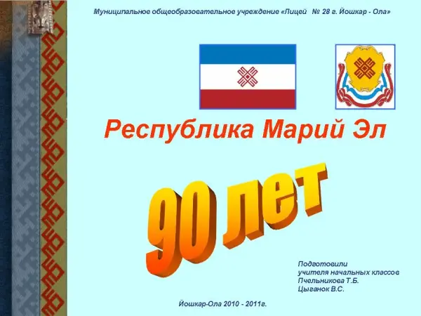 Праздник посвящен 90-летию Республики Марий Эл. Праздник ведут сами ребята и рассказывают одноклассникам о природе, о расположении республики, о ее исторических достопримечательностях. Это развивает кругозор, воспитывает патриотизм и любовь к малой родине. Привлекаются мамы, бабушки и дедушки, что способствует укреплению семейных традиций.