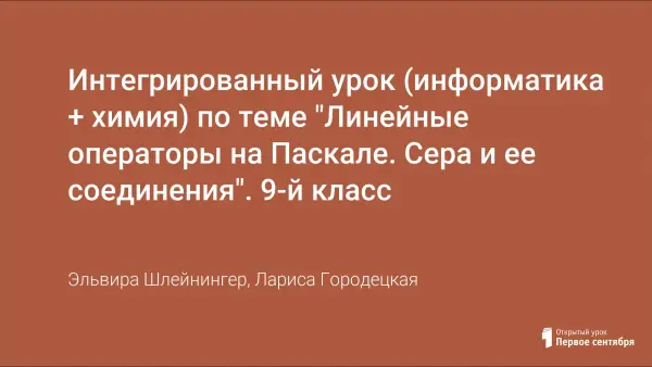 Интегрированный урок в 9-м классе обобщает знания учащихся по теме по информатике «Линейные операторы на Паскале» и по химии «Сера и ее соединения». На уроке закрепляются полученные знания по двум предметам при помощи тестирования, практических работ, расширяют свой кругозор и пополняют знания с помощью ИКТ.
