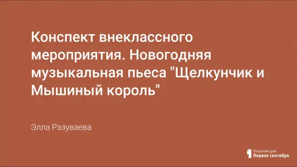 Актуальность данного мероприятия состоит в том, чтобы приобщить детей к атмосфере волшебного новогоднего таинства предпраздничных дней, подвигнуть к проявлению добрых чувств и пожеланий друг другу. Цель: ввести детей в атмосферу сказки Э.Т.А.Гофмана; подготовить учащихся к восприятию главной идеи сказки: в жизни должно торжествовать добро, справедливость, верность, а зло должно быть наказано. Задачи: познакомить со сказкой Э.Т.А.Гофмана «Щелкунчик и мышиный король»; приобщать детей к миру искусства через участие в музыкальной сказке; прививать любовь к классической музыке, к творчеству П.И.Чайковского.