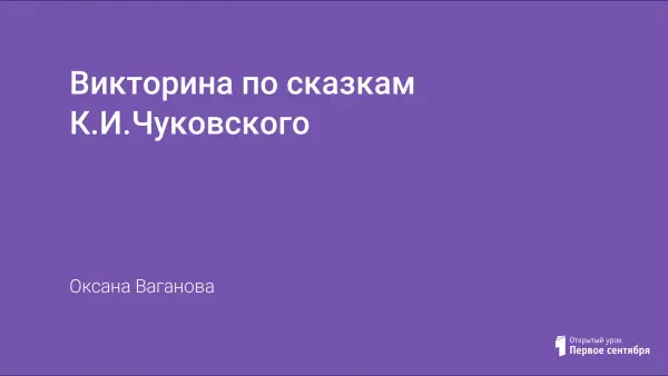 Урок систематизации и обобщения знаний и умений в 1-м классе в форме викторины по сказкам К.И.Чуковского. На уроке учащиеся знакомятся с жизнью и творчеством К.И.Чуковского. Цель урока: показать детям удивительный мир сказок, их мудрость и красоту, выявить читательский интерес. Урок сопровождается презентацией.