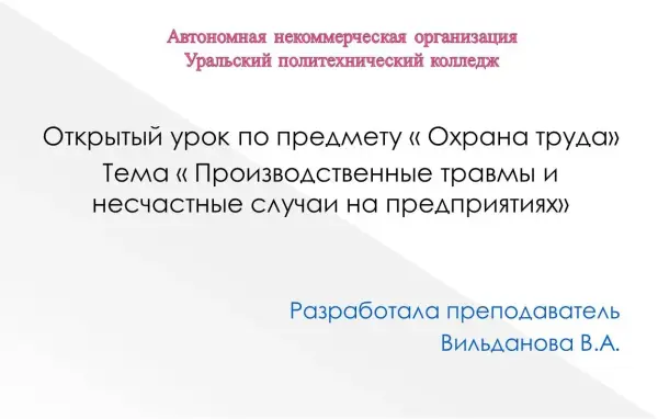 Цели занятия: сформировать у обучающих представление о значимости организационных основ безопасности труда; изучить основные виды и причины производственных травм и несчастных случаев; научить студентов использовать полученные знания при решении различных производственных ситуаций.