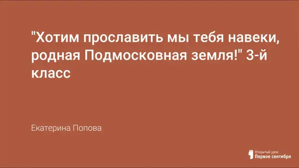 Внеклассное мероприятие с красочной презентацией о Подмосковье, народных промыслах и художественных ремеслах, которыми издавна славится Московская область. Детям предоставляется возможность стать исследователями и народными умельцами, побывать в разных уголках своего родного Подмосковья.