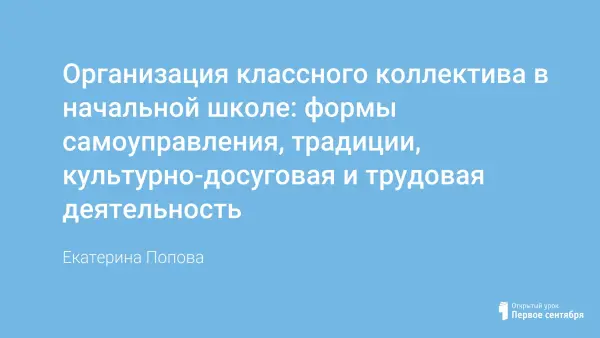 В статье "Организация классного коллектива в начальной школе: формы самоуправления, традиции, культурно-досуговая и трудовая деятельность" описан опыт работы учителя начальных классов по формированию классного коллектива: формы организации самоуправления, традиции класса, организация культурно-досуговой и трудовой деятельности учащихся.