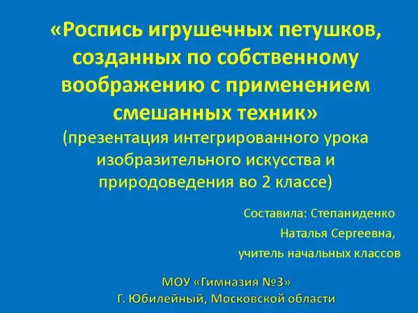 Занятие знакомит детей с разнообразием петушков, появлением их на свет, их значением. Наблюдая за видами росписи, ребята развивают воображение. Они не копируют созданные ранее образы, а придумывают свои формы и элементы росписи.