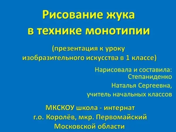 Данная презентация помогает сделать урок более красочным, каждый слайд расширяет знания детей о видах жуков и среде их обитания. Понятия «симметрия» и «монотипия», «основные и составные цвета» закрепляются зрительно в детской памяти. При проведении игры есть возможность сравнить детский результат с правильным решением. Подведение итогов – выставка детских работ, даёт возможность сравнить данные работы детей с предложенными в презентации.