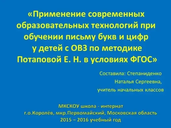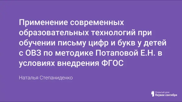 При работе с детьми с ОВЗ возникают трудности обучения письму букв и цифр. Применение методики Потаповой Е.Н. существенно облегчает процесс учения. В процессе игровых ситуаций через ощущения с активным включением зрительного и слухового анализаторов формируются не только понятие о букве (цифре) и её графическом начертании. Но и развиваются мышление, речь, память, а также творческие способности учащихся, решаются в комплексе задачи обучения и воспитания.
