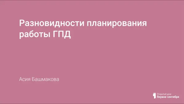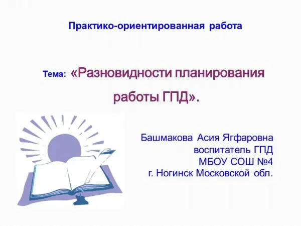 Цель работы: планирование работы ГПД 1-х классов. Для достижения данной цели выдвинула такие задачи: определить принципы, содержание, формы и методы планирования работы ГПД; изучить технологии взаимодействия воспитателя с учащимися.