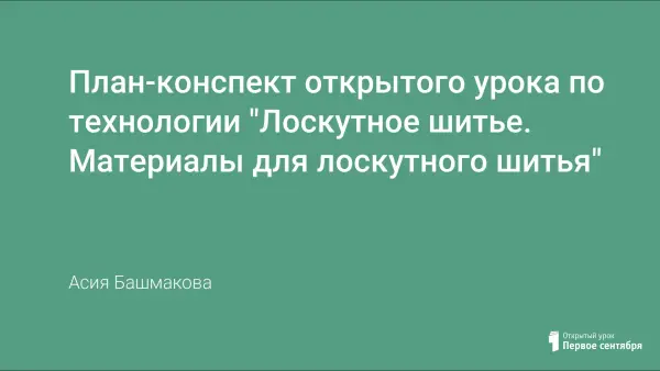 Цель урока: изучение одного из видов традиционного народного творчества; научить учащихся подготавливать ткань к работе; подбирать по цвету "лоскуты"; выполнять раскрой деталей по шаблонам.