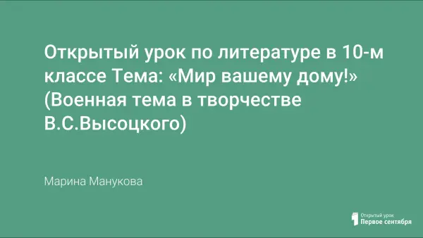 Цель урока: вызвать у моих собеседников живой интерес к личности, произведениям В.С.Высоцкого; воспитание патриотических чувств, любви к Отечеству, уважения к ратному труду военнослужащих и ветеранов войны. Ведь наиболее трагичные, переломные периоды в истории оставляют самый яркий след в искусстве, в частности, в лирике.
