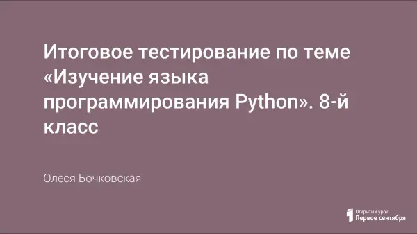 Предлагается тест для итогового тестирования по информатике в 8-м классе после изучения темы «Язык программирования Python».