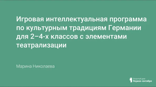 Игровая программа по культурным традициям Германии для 2–4-х классов представляет собой интеллектуальную игру с элементами театрализации для учащихся начальной школы. Для того чтобы участвовать в командах, нужно было почитать и вспомнить сказки немецких авторов.