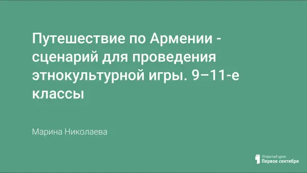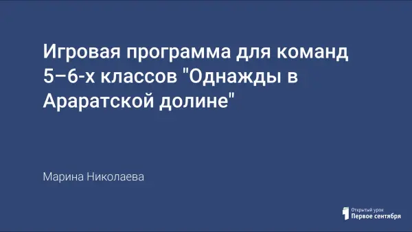 Игровая программа для командного первенства 5–6-х классов. Знакомство с Арменией по источникам, доступным в библиотеках и на интернет-ресурсах. Знакомство с известными людьми через презентацию: видеофрагменты об Армене Джигарханяне, Дмитрии Харатьяне, Ованесе Айвазовском, Араме Хачатуряне, в презентации вопросы – ребусы по географии Армении, часть вопросов посвящены традициям и обычаям армянского этноса.