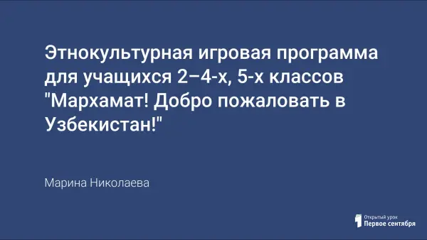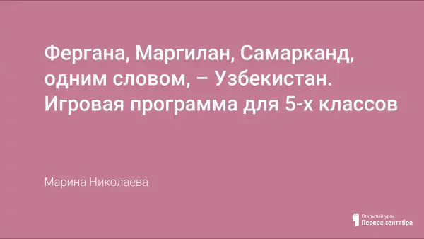 Игровая программа для 5–6-х классов по Средней Азии. Знакомство с традициями этноса, входившего в состав бывшего СССР и имеющего общие культурные аспекты и национальные, например: религиозные (мавзолеи, мечети, медресе). Известные люди: Тамерлан, Улугбек, Авиценна, сложно запоминающиеся и потом неоднократно повторяющиеся на других игровых программах о Средней Азии. Шелк, верблюды и хлопок, Великий шелковый путь.