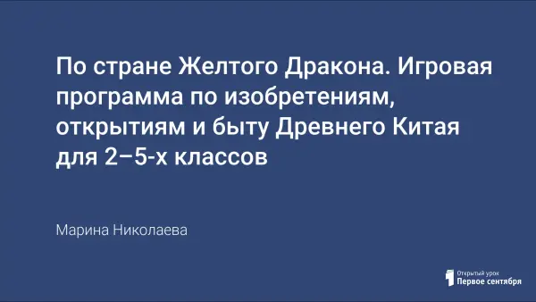 Игровая программа по изобретениям, открытиям и быту Древнего Китая рассчитана на подготовительный период для начальной школы и после изученных параграфов по истории Древнего мира в 5-м классе (можно без предварительной подготовки). Презентация и один видеовопрос поддерживается текстовым файлом.