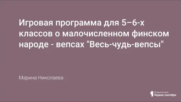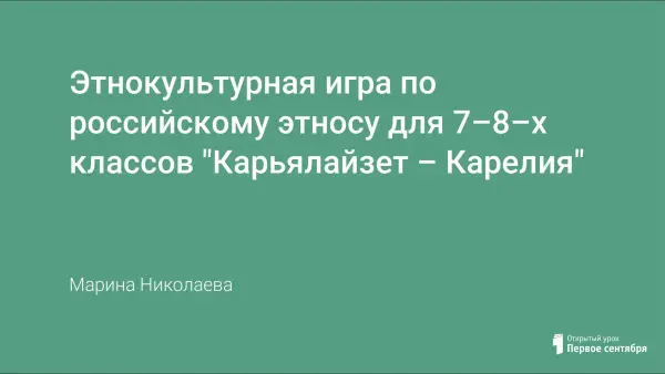 Этнокультурная игра по российскому этносу построена на культурных традициях одного из финских народов, проживающих на территории РФ. Рядом – граница с Финляндией, отсюда и много культурных заимствований. Знакомство с карельскими словами (рейкалейпя, калакукко, куккель, кукели, бахилы, Кегри), эпосом, одеждой и пищей. К сценарию для наглядного представления сделана презентация.