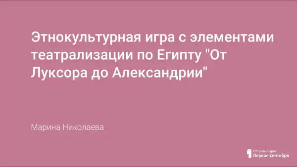 Египет – настоящая "жемчужина Востока". Страна древнейшей цивилизации, где можно увидеть древние пирамиды и сфинкса, золотые сокровища Тутанхамона и величественные храмы Луксора. Египет открыт для путешествий круглый год. Мы совершаем виртуальное путешествие по артефактам прошлого человечества. Сценарий поддерживается презентацией и видеофрагментами.