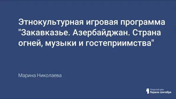 Азербайджан, Грузия и Армения известны как государства Закавказья. Программа рассчитана на 1 час и 20 минут. Знакомство с праздниками (Рамазан и Новруз байрамы) с достопримечательностями (Янардаг, Шуша) сочетается с музыкальными инструментами (гавал, тар, саз, ганун), стихотворениями поэта Низами Гянджеви (газели и касыды). Архитектура исторического Баку прослеживается в художественных фильмах «Человек-амфибия» и «Бриллантовая рука».