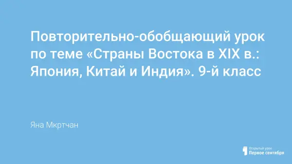 Цели урока: выявить общие тенденции развития стран Индии, Китая, Японии в XIX веке; определить влияние европейских стран на социально- экономическое и политическое развитие этих государств; охарактеризовать причины восстаний и итоги борьбы за национальную независимость.
