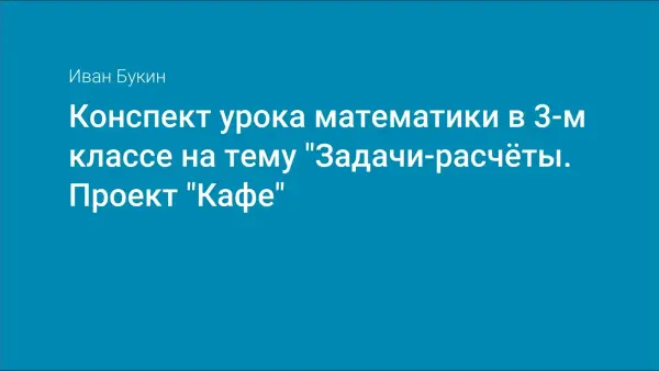 Урок математики разработан по теме «Задачи-расчеты. Проект «Кафе» для обучающихся 3-х классов общеобразовательных школ, программа «Школа России». Цель: создать проект кафе, используя задачи-расчеты (площадь, количество, стоимость, время). Подобранные задания направлены на формирование функциональной грамотности, коммуникативных, личностных, предметных и метапредметных результатов. Парная форма работы способствует активному взаимодействию обучающихся друг с другом и учителем.