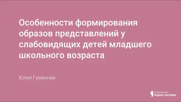 Качественные и количественные изменения, наблюдающиеся при патологических нарушениях деятельности зрительного анализатора, не могут изменить самой природы и характера образов-представлений. Фрагментарность, схематизм, недостаточная обобщенность, вербализм и узость круга образов памяти детей с нарушением зрения в значительной мере преодолеваются в процессе компенсации. Возникающие у них представления могут достаточно полно и адекватно отражать окружающий мир. Изучение литературы, рассматривающей формирование образов представлений слабовидящих детей, показало что, формирование образов представлений проходит те же стадии развития, что и при нормальном видении, но связи с недостаточностью функции зрения этот процесс затягивается и приобретает специфические особенности, на преодоление развития которых должна быть направлена коррекционная работа, педагогов дошкольного и школьного образования, тифлопедагогов, логопедов и дефектологов.