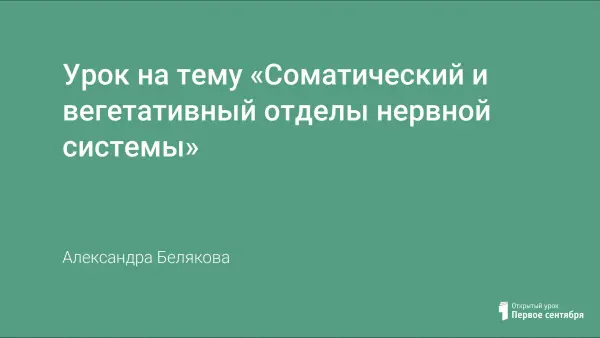 Материал содержит конспект урока на тему «Соматический и вегетативный отделы нервной системы» и презентацию. Он может использоваться на уроках в профильных классах, так как содержит несколько углубленный материал, а также в обычных классах. В конспекте содержится тест для закрепления по теме «Нервная система»