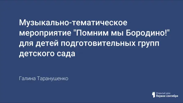 Представлен конспект музыкально-тематического мероприятия для детей подготовительных групп детского сада. Мероприятие посвящёно событиям Великой Отечественной войны 1812 года и приурочено к 200-летию Бородинского сражения. Основная цель: знакомство детей с историческим прошлым нашей страны, воспитание чувства гордости за мужество и отвагу своего народа, воспитание патриотических чувств и уважительного отношения к российской армии.