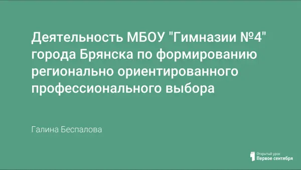 В статье представлен опыт реализации образовательного проекта "Брянск и Я", цель которого – разработка организационной и содержательной модели деятельности школы по формированию регионально ориентированного профессионального выбора обучающихся. Реализация проекта позволила получить значимые образовательные эффекты: рост интереса учащихся к региону, выстраивание целостного индивидуального образовательного маршрута, формирование устойчивой мотивации жизни и работы на Брянщине.