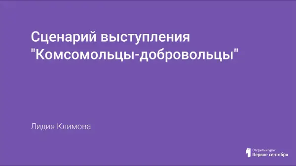 Данный документ представляет собой сценарий выступления, посвящённый 100-летию рождения ВЛКСМ. В театрализованном материале ярко переданы дух времени комсомольцев, их героическая борьба и труд. В разработке отражается преемственность поколений, связь времён, звучит мысль о любви к родине, что важно для воспитания подрастающего поколения. Материал содержит в себе наравне с пафосным звучанием и юмор. Участниками выступления могут быть все члены образовательного процесса: учителя, школьники и родители.