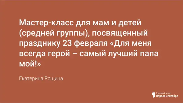 Задачи мастер-класса: знакомить детей с традицией празднования Дня защитника Отечества; формировать умение детей рассказывать о папе. Развивать внимание, любознательность, мелкую моторику рук; повысить педагогическую компетентность родителей в вопросе различных форм конструирования; привлечь родителей к активному участию в образовательном процессе детей; создание композиции, посвященной Дню защитника Отечества.