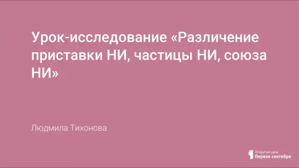 Цель урока: организация исследовательской деятельности учащихся по обобщению и систематизации знаний по теме «Различение приставки НИ, частицы НИ, союза НИ», в результате чего учащиеся будут знать определения морфемы, частицы, союза и их роли в словообразовании и предложении, уметь различать приставку НИ, частицу НИ, союз НИ-НИ, применять полученные знания на практике.