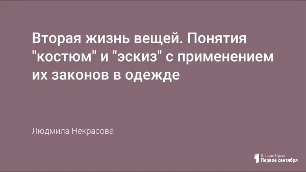 Статья представляет собой методическую разработку урока «Вторая жизнь вещей». Понятия «костюм» и «эскиз» с применением их законов в одежде. Тема урока изучается в разделе рабочей программы «Работа с тканью». По типу урок является комбинированным, при этом целесообразно использование на уроке различных форм организации деятельности учащихся и методов передачи знаний.
