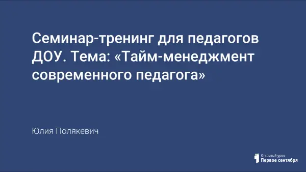 Цель тренинга: трансляция опыта педагогической деятельности по формированию рабочего времени и пространства воспитателя. Задачи: предупредить возможные затруднения в работе молодых специалистов, акцентировать внимание опытных коллег на факторах препятствующих эффективности профессиональной деятельности; познакомить с базовыми понятиями тайм-менеджмента, как отрасли науки управления; совершенствовать аналитические умения педагогов.