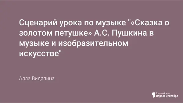 На данном уроке учитель стремится проследить жизнь пушкинской сказки в музыке (в опере Н.А.Римского-Корсакова "Золотой петушок"), в изобразительном искусстве (в иллюстрациях к сказке И.Билибина). Цель урока: используя современные технические средства обучения, решая учебные обучающие, развивающие, воспитательные задачи, показать взаимодействие и взаимодополнение трех видов искусств.
