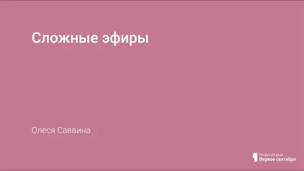 Урок “Сложные эфиры” построен на основе использования информационных технологий и методов развивающего обучения. В ходе урока у обучающихся формируются представления о составе и строении сложных эфиров, способах их получения и применения. Во время урока используются различные виды учебной деятельности: работа с терминами, групповая практическая работа.
