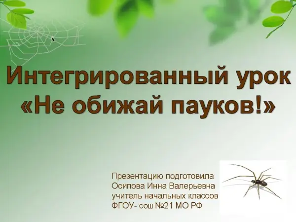 Интегрированный урок по УМК Школа России обобщает знания о царстве животных, повторяет пройденные орфограммы, знакомит с новым словарным словом ПАУК, со многими представителями класса арахнидов, пользой, которую приносят пауки. Ученики вышьют красивую паутину, сделают пауков из пуговицы и ниток и научатся их беречь.