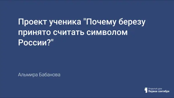 Цель работы: изучение энциклопедических сведений о дереве береза, сбор материала по истории России, устному народному творчеству, язычеству, литературе, живописи и музыке для выявления причины, почему березу принято считать символом России. Краткое содержание: в работе представлены полезные сведения о растении береза, а также интересные материалы об использовании данного дерева в жизни, быту русского народа, примеры образа березы в искусстве и устном народном творчестве.
