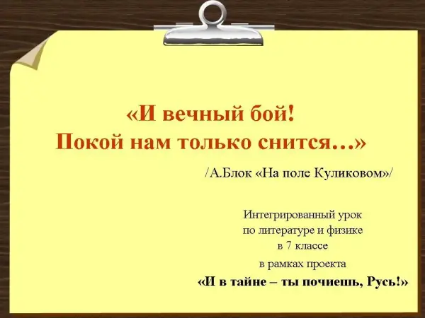 Урок в рамках проекта "И в тайне – ты почиешь, Русь!", главная суть которого заключается в погружении учителей и учащихся в определённую историческую эпоху. Первая часть проекта – время Киевской Руси: знакомство с историческими документами, литературными произведениями, общественной жизнью государства. Вторая часть проекта – в деталях изучить событие, которое сыграло большую роль в истории России, – Куликовскую битву. Новый проект посвящён этой знаменательной дате.