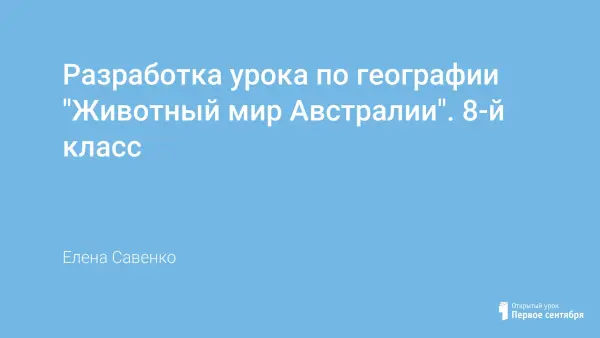 Данная работа предназначена для изучения материала по теме «Животный мир Австралии». Урок построен на деятельной основе с использованием информационных технологий. Используются медиапродукты, разработанные учителем на основе новых мультимедийных средств: тестеров, ИД, видеоролик, которые придают уроку интерактивный характер. Применение медиапродукта повышает эффективность восприятия информации, способствует развитию аналитико-синтетического мышления, организации самоконтроля.