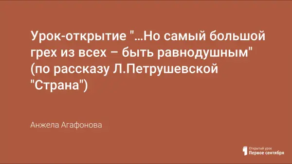 Урок-открытие по рассказу Л.Петрушевской «Страна» ориентирован на учащихся 10-го класса. Это урок раздумья, размышления над такими вопросами, которые рано или поздно каждый из нас решает для себя сам. Что такое любовь к ближнему, уважение, забота об окружающих? Какую роль в нашей жизни занимают наши родные и близкие? На представленном уроке поднимаются проблемы, актуальные для всех нас, проблемы семьи, одиночества, материнства.