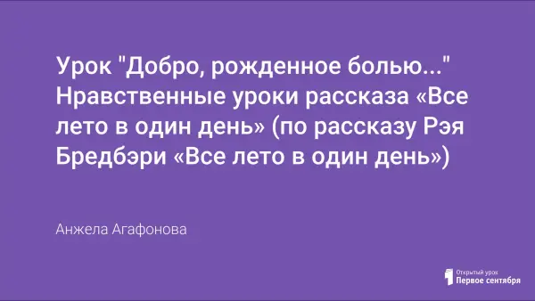 Урок «Добро, рожденное болью…» Нравственные уроки рассказа «Все лето в один день» (по рассказу Рэя Бредбэри «Все лето в один день») предназначен для учащихся 7-го класса. Цель его – совершенствовать навыки анализа литературного текста, умение работать с эпизодами произведения; воспитывать толерантность к окружающим людям; формирование представления о добре и зле; развивать нравственные чувства, уважения к культуре народов.